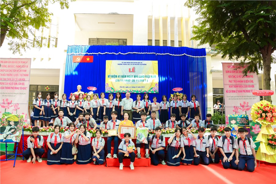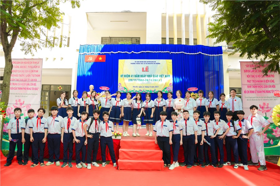 Hằng năm, cứ mỗi khi gió heo may về với một chút se lạnh, tia nắng vàng cuộn mình trong những chiếc lá khô, tháng 11 về với bao thương nhớ, bao nỗi niềm bồi hồi xao xuyến. “Tôn sư trọng đạo” “Uống nước nhớ nguồn” chính là truyền thống quý báu của dân tộc ta. Từ những nét chữ đầu tiên đến những bài học vỡ lòng cho các em hành trang bước vào đời, tất cả đều là tấm lòng yêu trò yêu nghề của quý thầy cô giáo. Thực hiện theo lời dạy của Chủ tịch Hồ Chí Minh kính yêu: “Vì lợi ích mười năm trồng cây, vì lợi ích trăm năm trồng người”, toàn Đảng, toàn dân ta luôn chăm lo cho sự nghiệp giáo dục đào tạo của nước nhà. Năm 1982, Đảng và nhà nước ra đã có quyết định lấy ngày 20/11 hằng năm là ngày Hiến chương Nhà giáo Việt Nam. Kể từ đây, ngày 20/11 hằng năm ở nước ta trở thành một ngày hội của các thầy cô, của những người làm công tác giáo dục và quản lý giáo dục trên cả nước.Ngày này là ngày mà các cấp, các ngành quan tâm động viên tới những người làm công tác giáo dục cũng như là ngày để biết bao thế hệ học sinh Việt Nam thể hiện sự biết ơn vô cùng sâu sắc với công lao dạy dỗ ta nên người của các thầy cô giáo. Hòa chung không khí tưng bừng, hứng khởi của ngành giáo dục cả nước kỷ niệm 41 năm ngày Nhà giáo Việt Nam (20/11/1982 - 20/11/2023). Trường THCS Nguyễn Thị Hương long trọng tổ chức lễ kỉ niệm 41 năm ngày nhà giáo Việt Nam.